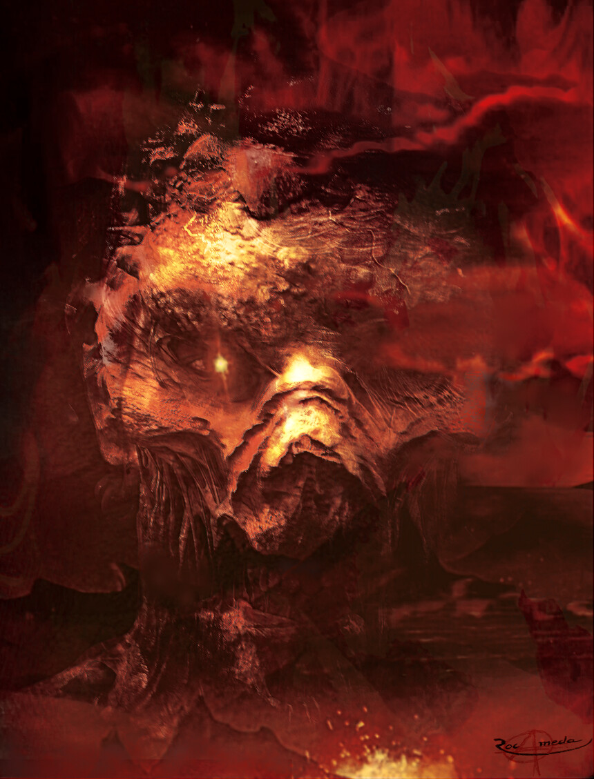 Hormis le foulard de soie rouge noué élégamment autour de son cou taurin, au demeurant délicatement assorti au reste du mobilier de la suite, le colosse monstrueux s’affichait, le plus souvent, torse nu, moulé dans un très avantageux pantalon de cuir noir, surmontant une longue paire de bottes à l’éclat ténébreux, battue par les neuf verges sanglantes d’un terrifiant knout négligemment accroché à sa ceinture. Varahul tirait formellement son style vestimentaire barbare d’une fresque, devenue mythique depuis, le représentant sous les traits d’un titan, avide dévoreur de l’Univers. L’œuvre avait été commise, jadis, par un peintre de Sécoris, un rien halluciné et traumatisé après que l’artiste eut été le témoin malheureux d’une des trop nombreuses épouvantables hécatombes perpétrées par l’odieux dieu des Aveuglements. La peinture constituait désormais le morceau de choix de son petit musée personnel des horreurs. Comme aucun miroir n’était, à juste titre, réputé pouvoir soutenir sans dommage son pénible reflet, ce dieu, fléau ultime, ravageur de l’espace et du temps, adorait passer ses quelques moments de narcissisme effréné à reluquer l’ouvrage. Il s’extasiait alors, contemplant durant de longues périodes son éternel sourire, copieusement bardé d’inquiétants crocs. À ce titre, leur proéminence toute particulière n’était pas sans évoquer quelques sauvages et sinistres rivages déchiquetés par de redoutables pitons entre autres écueils minéraux.